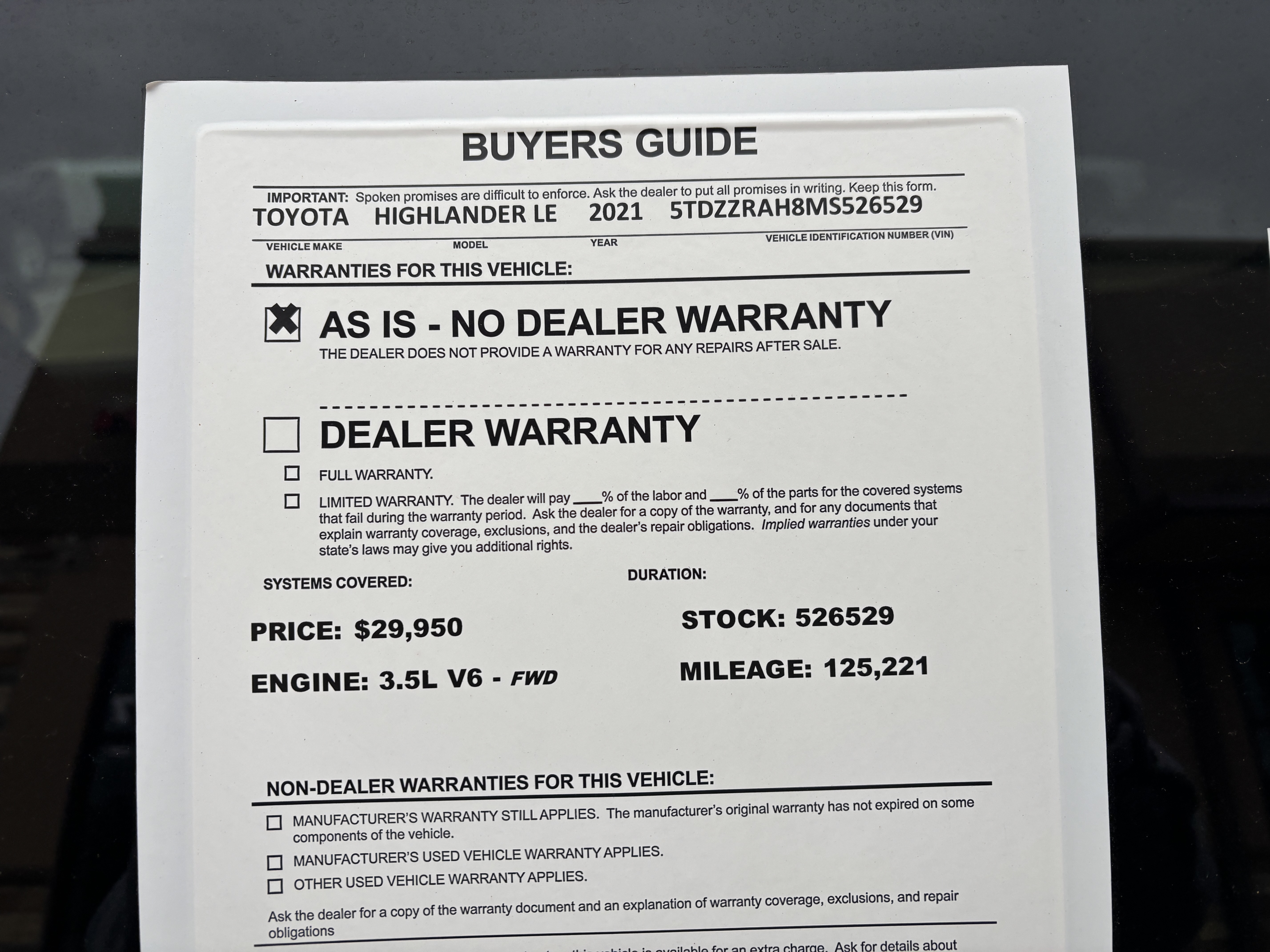 2021 Toyota Highlander LE FWD V6